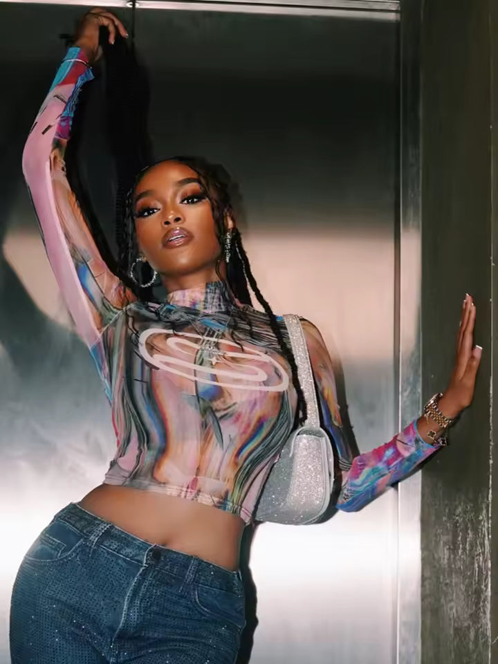 The Chromatic Swirl Mesh Top is your canvas of color — a sheer, second-skin piece designed to turn heads and shift energy. With psychedelic swirls and a body-hugging fit, this top brings movement, mood, and magnetism to every outfit.
