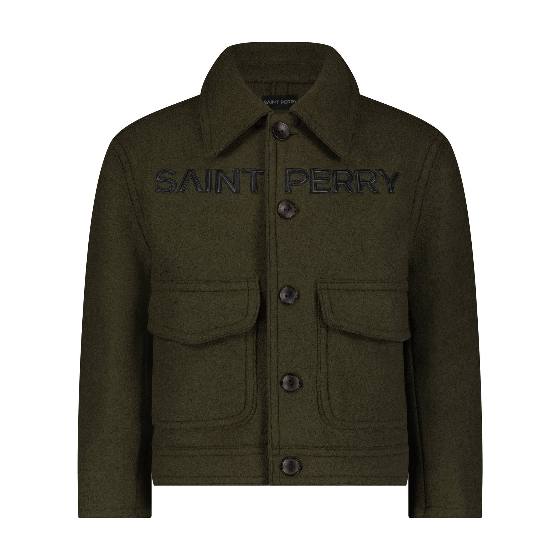 The jacket features SAINT PERRY logo leather embroidery, adding a touch of sophistication and brand identity. It also has a double-faced construction and is hand-sewn for quality craftsmanship.